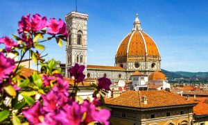 Dome of cathedral church Santa Maria del Fiore close up at spring day, Florence, Italy, retro toned